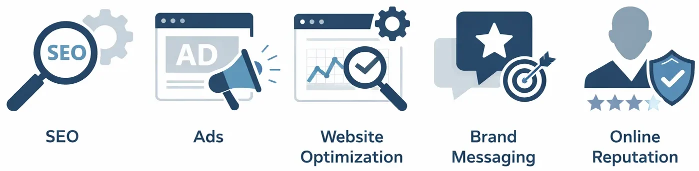 We start by reviewing your website, SEO visibility, paid ads, and overall digital presence to identify what’s working and what’s holding growth back.